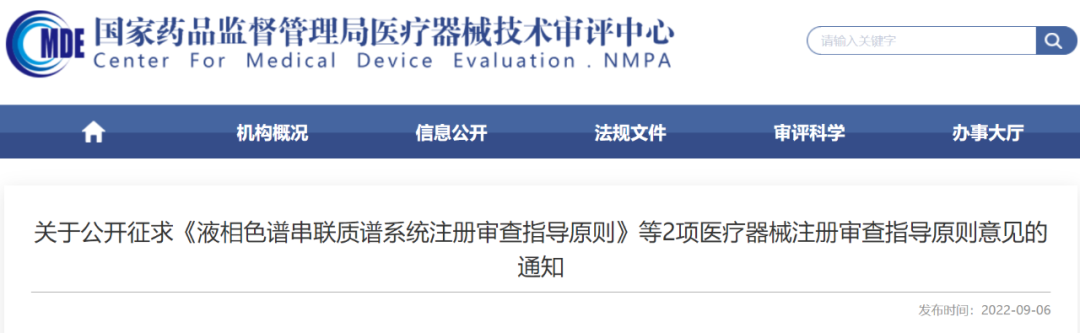 根据国家药品监督管理局医疗器械注册审查指导原则项目计划的有关要求,我中心组织编制了《液相色谱串联质谱系统注册审查指导原则》等2项第二类指导原则(附件1),现已形成征求意见稿,现向社会公开征求意见。如有意见和建议,请填写意见反馈表(附件2),并于2022年9月28日前反馈至相应的联系人(附件3)。