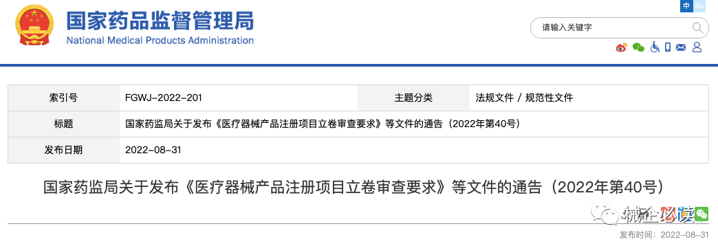国家药监局关于发布《医疗器械产品注册项目立卷审查要求》等文件的通告(2022年第40号)